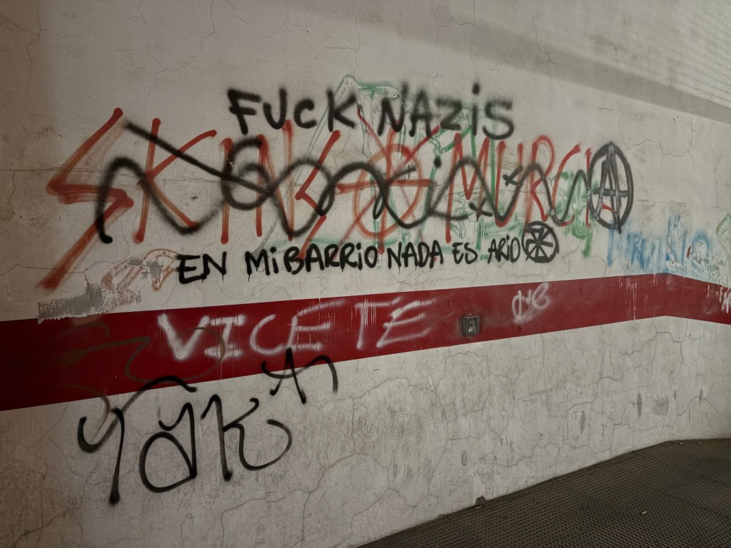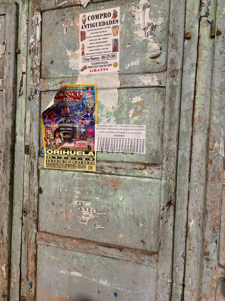 Outside the post office I read a piece of paper someone tacked onto a streetlamp. It writes: se ofrece chica para cuidado de mayores y niños o limpieza de casa with her phone number. Instinctively I translate it as girl offers herself which in one sense is true, and in another sense is probably less true. A typical American equivalent might read: Looking for work, but never would we offer ourselves so completely.There’s a lot of graffiti in this town, most of which I can’t understand except for one near the Police Station––a pro-Nazi tag that reads “Skins ⊕ Murcia” which is covered by another tag reading “Fuck Nazis, en mi barrio nada es ario”. In my neighborhood, no one is aryan. Whether this has anything to do with the police or not I have no idea, the location could be coincidental.